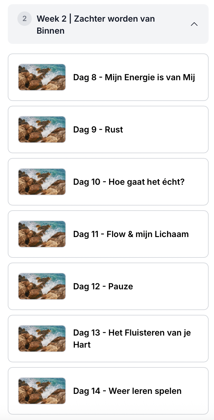 Deze reis heb ik ontworpen zodat jij weer contact leert maken met jezelf en met je lichaam. Het doel is rust, ruimte en blijvende verandering die je de rest van je leven meeneemt.